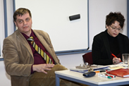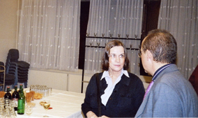 | Claudia Schweizer im Gespräch mit dem Leiter der VHS Wien-Hiezing Robert Streibel am Eröffnungsabend. |